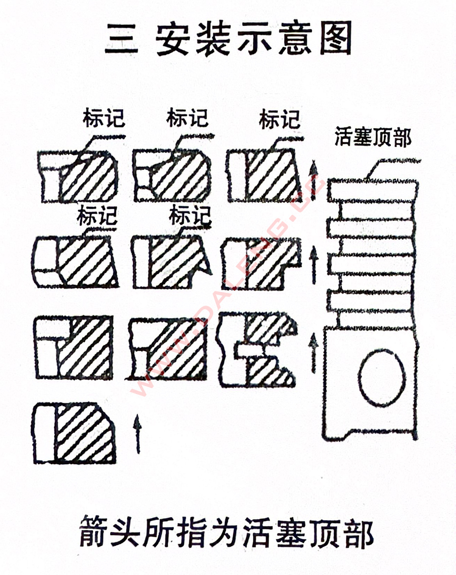 6.凡有以下截面形状的活塞环,必须按安装示意